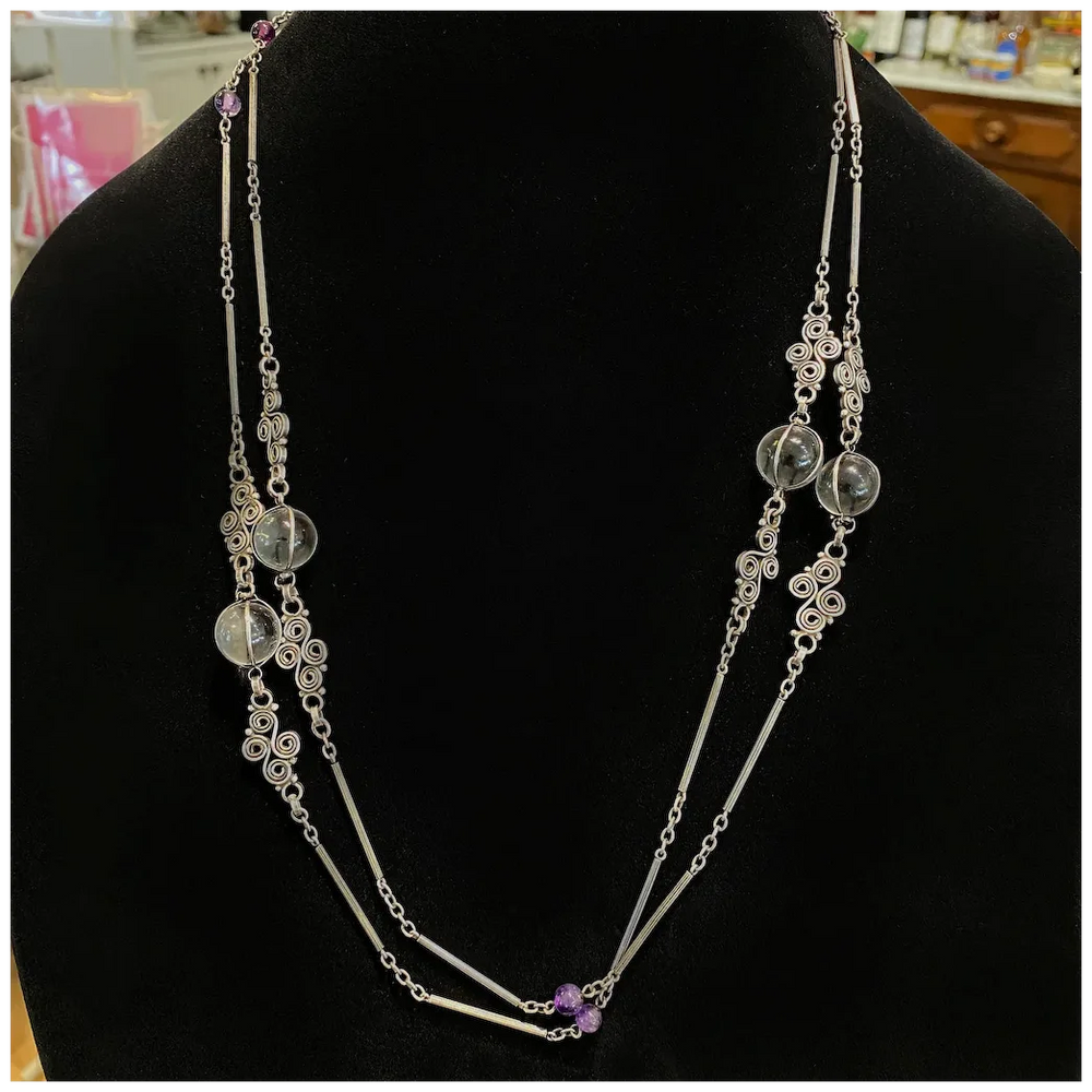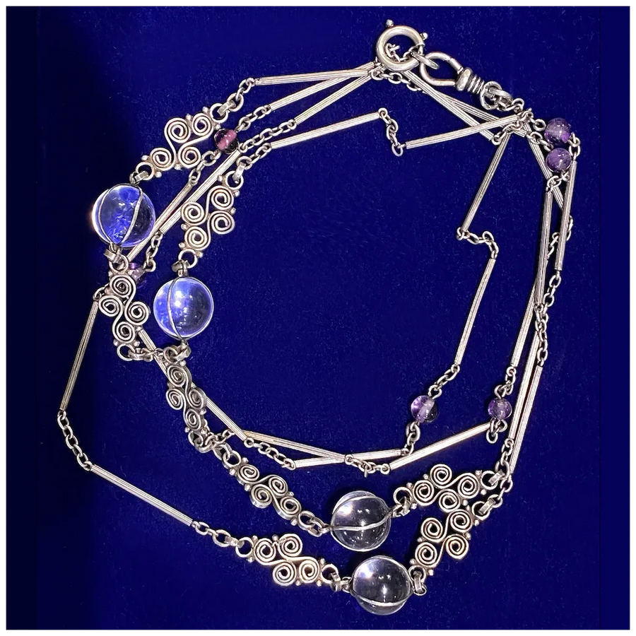 Handcrafted around 1900 and measuring an impressive 54 inches in length, this necklace is made from silver marked 800, with additional hallmarks softened by time. The chain features four clear rock crystal orbs (12.6–13.4 mm) in open-backed, wire-wrapped mounts and six amethyst beads (5.25–6.37 mm) spaced delicately along its length. The piece closes with a period-appropriate drop clasp. It weighs 47.2 grams.