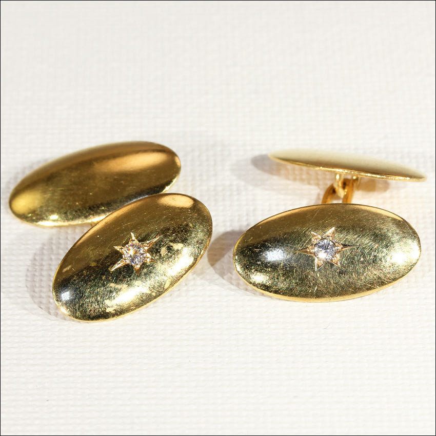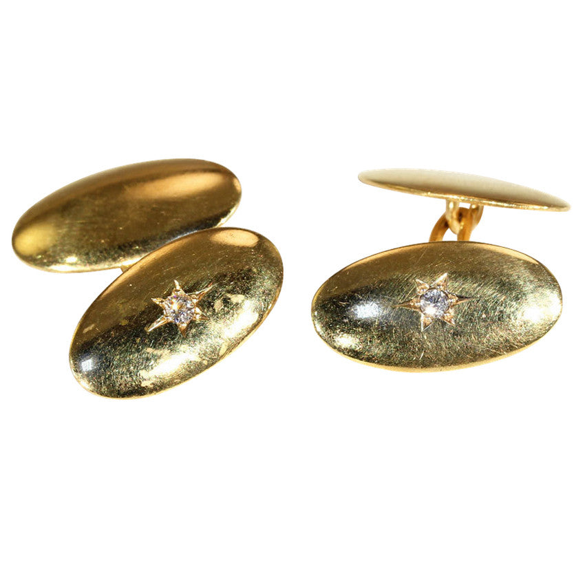 These classic links are the perfect combination of cool and flashy. They don't brag, but they let you know that they have a little something extra to offer. Set into smooth ovals of 15k yellow gold are transitional cut diamonds that measure 2.7 mm across. The overall size of the links is 20 mm x 10 mm and they weigh 7 grams. Handmade in England around 1910.