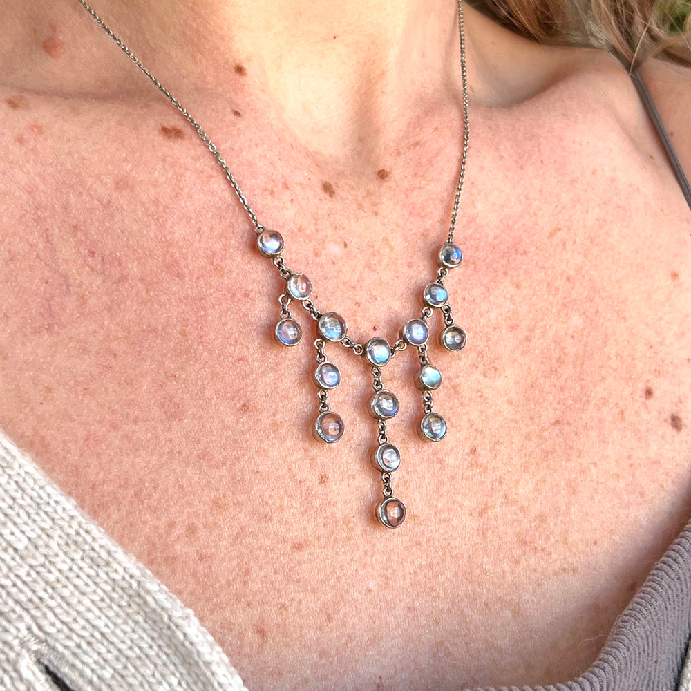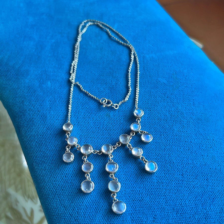 Like drops of moonlight strung along a silver thread, this ethereal necklace casts its soft glow with every movement. Sixteen cabochon-cut moonstones shimmer with adularescence, each one flickering with pale blue fire as if lit from within. Suspended in a gentle fringe, the stones create a graceful silhouette at the collarbone, delicate, luminous, and quietly mesmerizing.