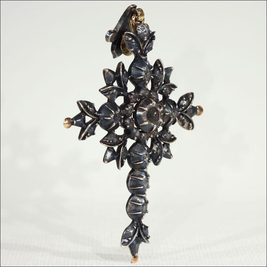 Known as a Flemish Cross, this cross is not only a symbol of faith, but a sign of fashion. A diamond cross did not simply decorate the necks of the wealthy, during the 18th and 19th centuries, but gave power and style to the devout. This cross, with a rose motif, is symbolic of the Virgin Mary. Traditionally, beautiful woman in the 19th century would receive this expensive gift and wear it with a long silver chain. Today, many of these Flemish crosses are owned by the church or in private collections.