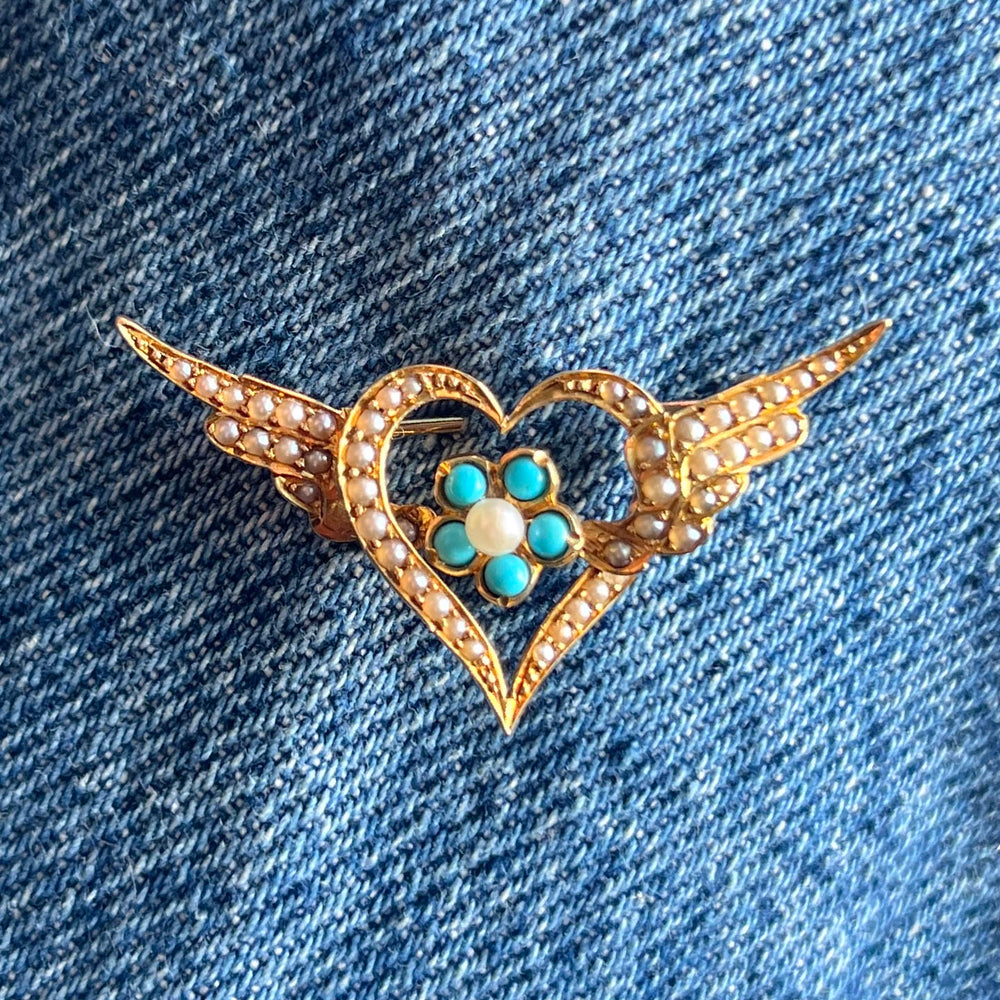 Handcrafted around 1900, this unmarked brooch has been tested as 15 karat gold. It measures 20 mm tall and 41.5 mm across, with a depth of 7.5 mm and a weight of 3.97 grams. The heart and wings are set with 45 seed pearls, and the floral centerpiece includes five turquoise cabochons measuring 2.5 mm each, arranged around a central 3 mm pearl.