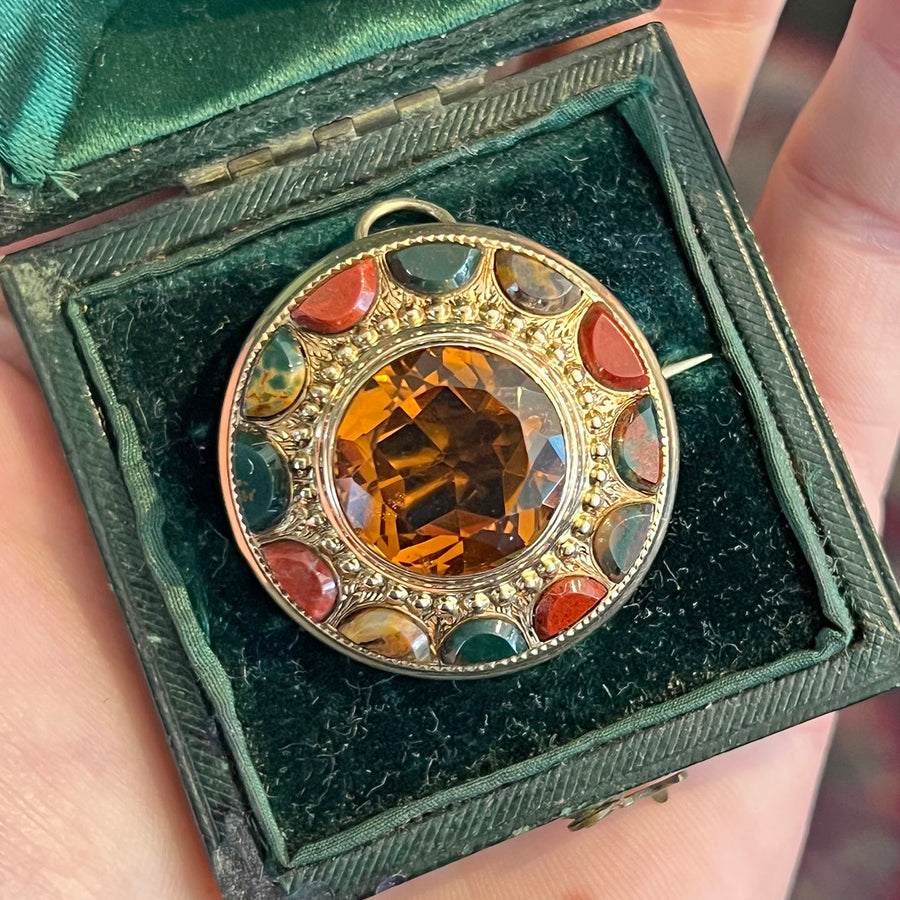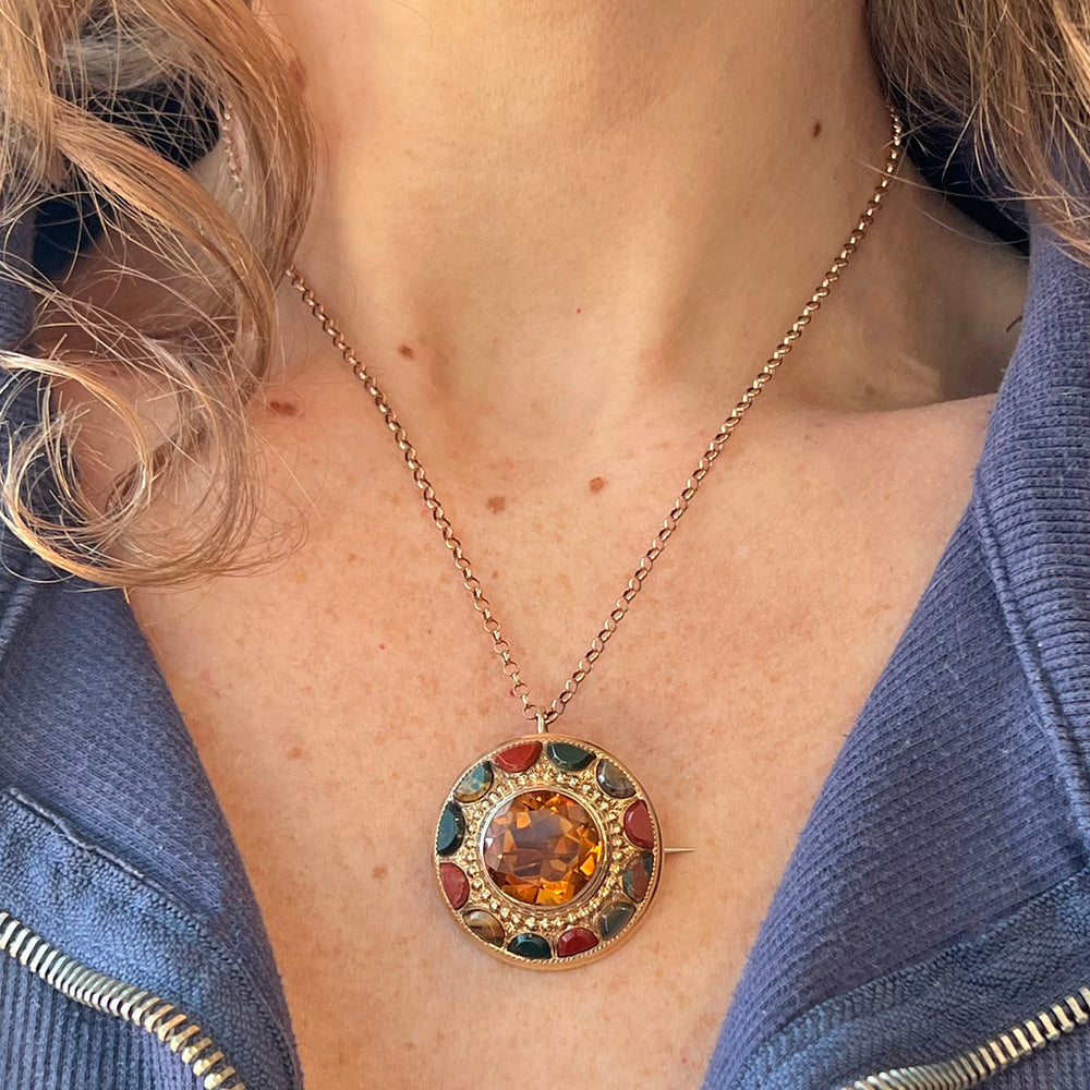 Like something worn at court in the Highlands, this Victorian Scottish brooch glows with warmth and heritage. At its heart lies a magnificent citrine that is fiery, golden, and precisely cut to flash with every turn. Around it, polished agate segments form a bold halo of earthy reds, mossy greens, and misty greys, each a tiny landscape from the hills of Scotland. The piece can be worn as a brooch or pendant, a treasure designed for both ceremony and sentiment.