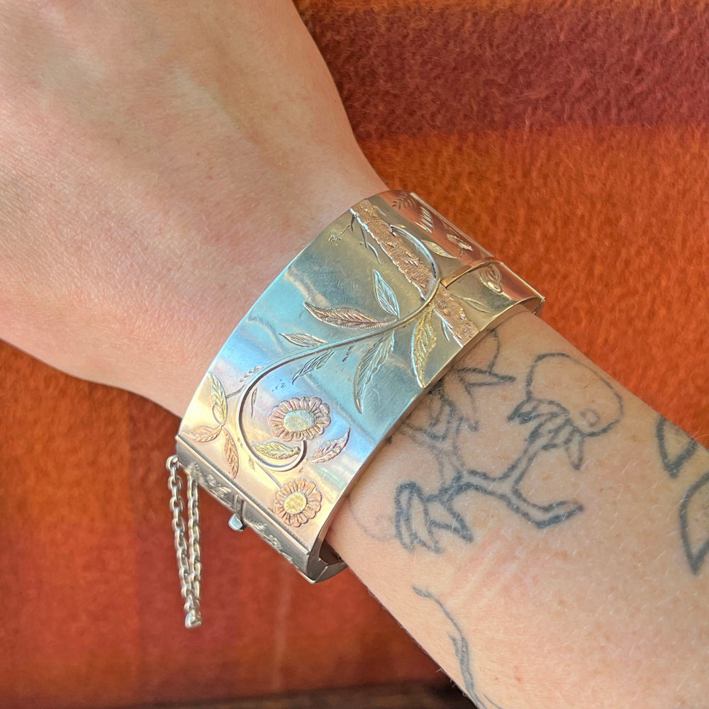 There’s a moment captured here, a pause in nature’s rhythm. A songbird perches gently on a branch, wings tucked, as blossoms bloom in stillness around it. This Victorian silver bangle is an exquisite ode to the Aesthetic Movement, when beauty was reason enough, and even the smallest leaf deserved reverence. The engraved scene wraps the wrist like a story told in gold and silver: a quiet garden, a peaceful watcher, and petals unfurling in rose and yellow gold against a backdrop of finely polished sterling.
