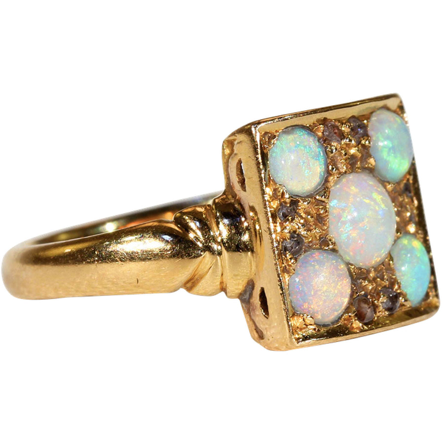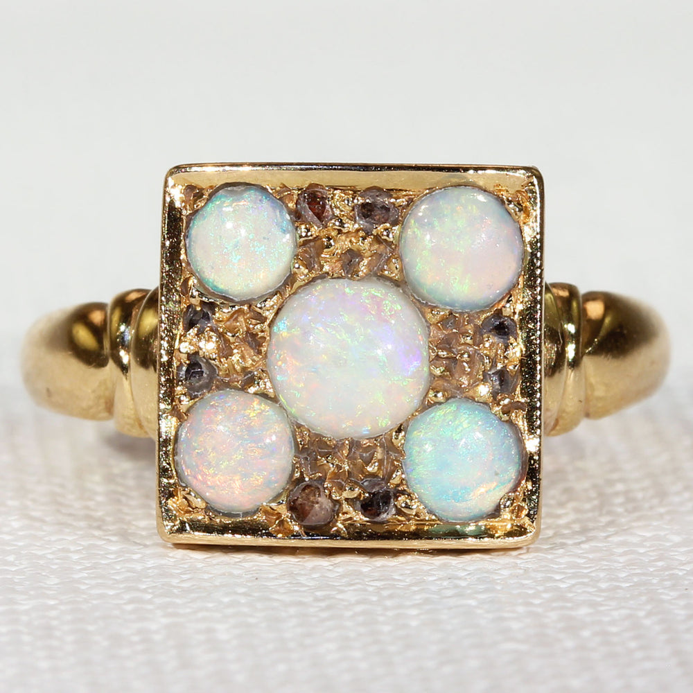 This vintage English Art Deco ring was handcrafted in London, in 1925. There are five luminescent round cabochon opals set on a square face. The center opal is the largest, measuring 4.5 mm in diameter and 1.9 mm deep. The other four are all 3.3 mm in diameter and 1.5 mm in depth, approximately. This gorgeous 18 karat gold piece is truly Art Deco in its display with dazzling colors, and geometric shape. It is fully hallmarked and bears the crown for England, leopard head for London, the gold purity mark, ‘18’, and the date letter, ‘k’. This ring is a size 5.75 and weighs 4.5 grams.
