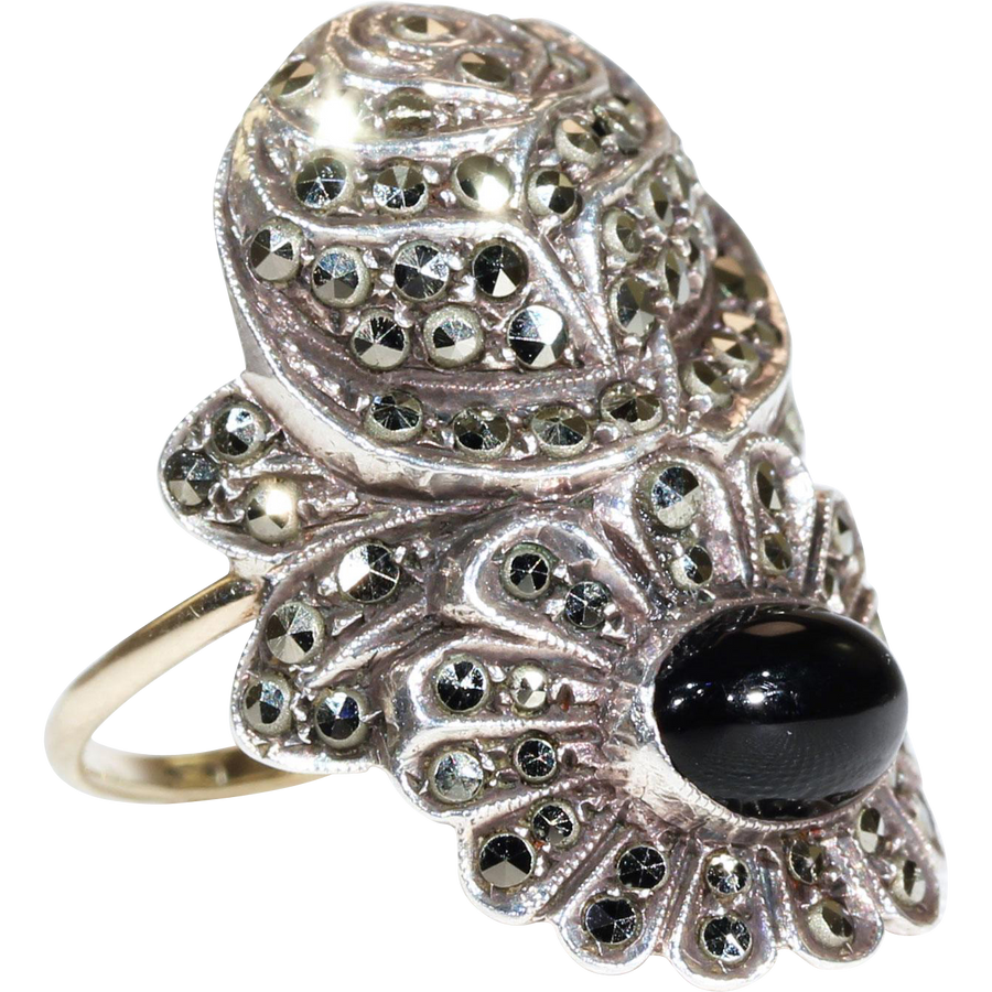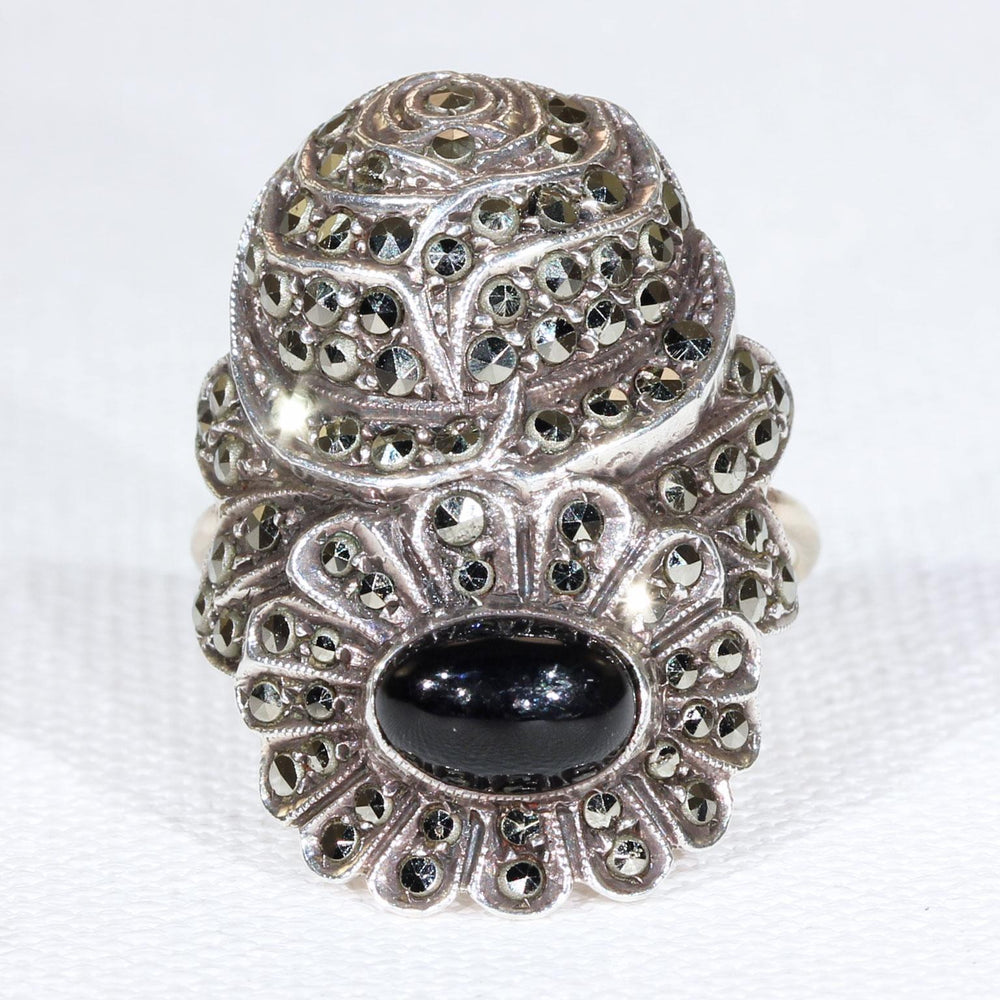 Art Deco Silver Marcasite Onyx Ring Gold Band Rose Daisy Flower