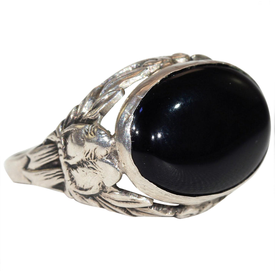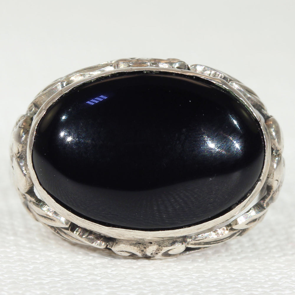 Fully hand crafted in sterling silver, this lovely ring is set with a smooth cabochon of black onyx. The onyx measures 16 mm across and 10.7 mm north to south and is 3.8 mm deep. The ring face overall measures 19 mm across and 13.8 mm north to south and sits 7 mm off the finger. This ring is a size 6 US and could be resized somewhat to suit. The ring weighs 3.5 grams.
