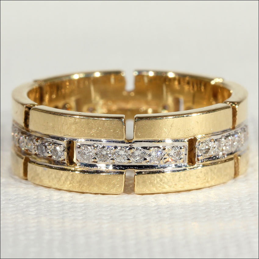 This band has a great feel on the hand and would play nicely with a thinner eternity band (or 2) or with a diamond solitaire. It would make a great wedding or anniversary band.