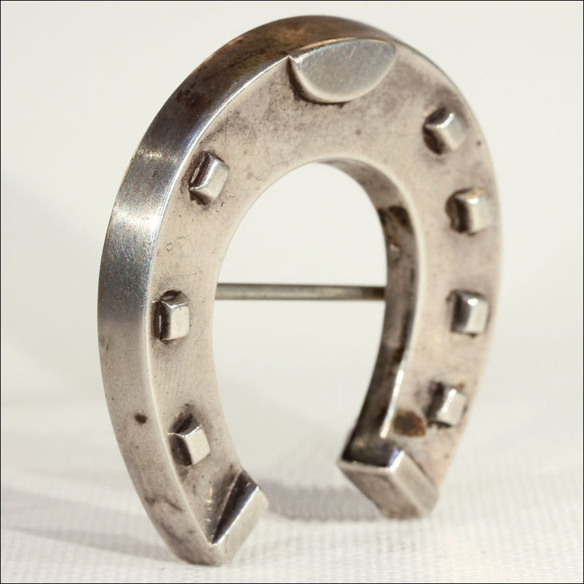 This silver horseshoe brooch is quintessentially English. With it’s wonderful detail and large size, it’s quite a beauty and I was certainly happy to stumble upon it while shopping the wonderful antiques fair at Ardingly. The brooch measures 1.5 inches (39.4 mm) long and equally as wide. I’m sorry, clearly we should have cleaned it a bit better before taking it’s photo, I’ll see that it gets a bit of a clean before it goes out. The back has a small dent, the front it perfect. While it’s unmarked, we’ve acid tested it to verify that’s crafted in sterling silver. It weighs 5.7 grams.