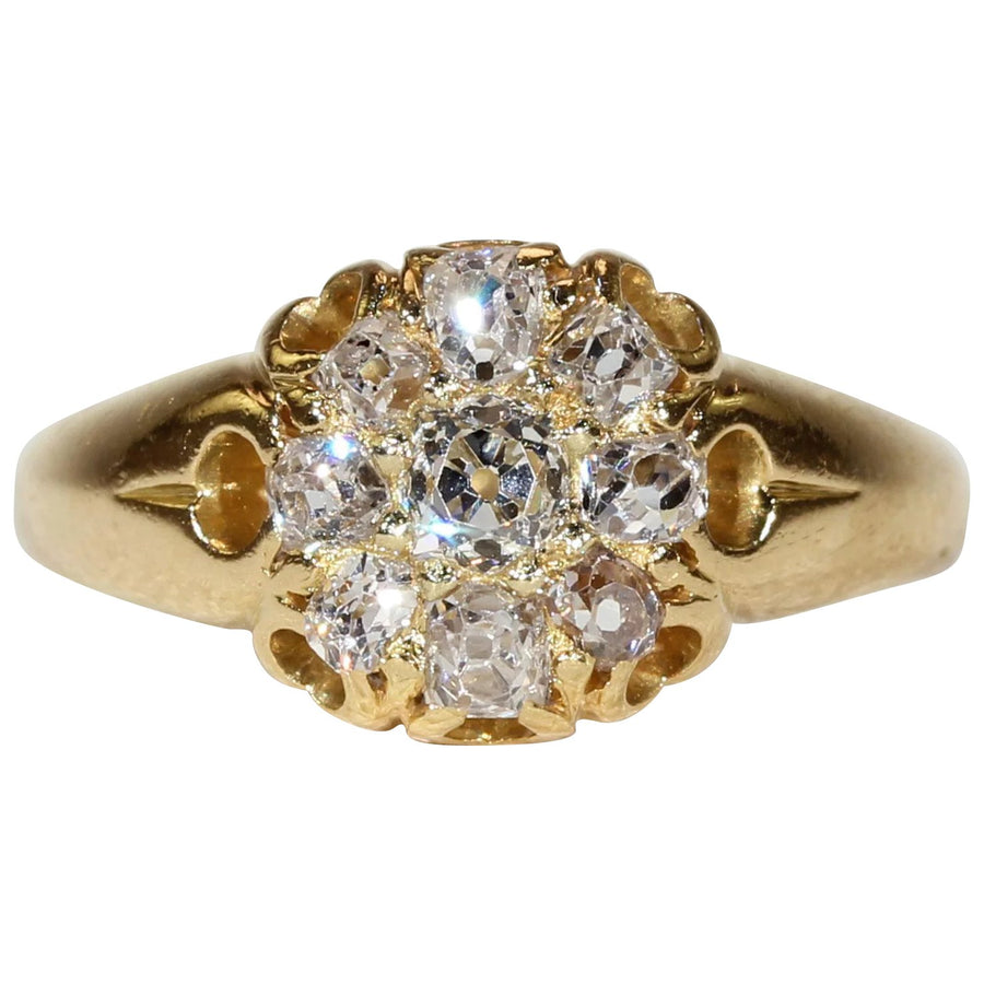 This antique Victorian diamond cluster gold ring was handcrafted in London around 1900. It boasts nine Old European cut diamonds weighing an approximate total of .75 carats. The center stone measures 3.5 mm in diameter and 2.2 mm in depth, weighing approximately .23 carats. This cluster ring was made in 18 karat gold and weighs 4.9 grams. The ring face measures 10 x 10 x 4.6 mm off the finger and the band width is 2.1 mm at the back. This piece is a size 7 US. It has been fully hallmarked and bears the crown mark for England, the gold purity mark, “18”, the leopard head mark for London, and the maker’s mark, “LA”.