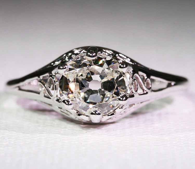 I found this lovely and enchanting diamond wallowing away in a very ugly brooch from the 70's. This fabulous stone deserved better, so I searched high and low until I found it. The perfect mount, 14 karat white gold, simple, hand pierced, classical scrolling design. The mount was stoneless, the diamond ringless, so I married them together to create the perfect recycled ring. The diamond is a symphony of light and color. An old European Cushion cut stone (cut around 1870-1880, I suspect) which weighs 1.26 carats out of the mount. I haven't had it graded, but it is a very, very clean and white stone. The facets are large and hand cut, creating a stone which sends off huge flashes of light in all colors of the spectrum. The mount is not too high, but holds the stone up high enough to allow tons of light to enter the stone for maximum effect. Made around 1920, it is currently a size 8.25, but can easily be sized. I had the jeweler re-tip the prongs when setting the stone so that it is very secure.