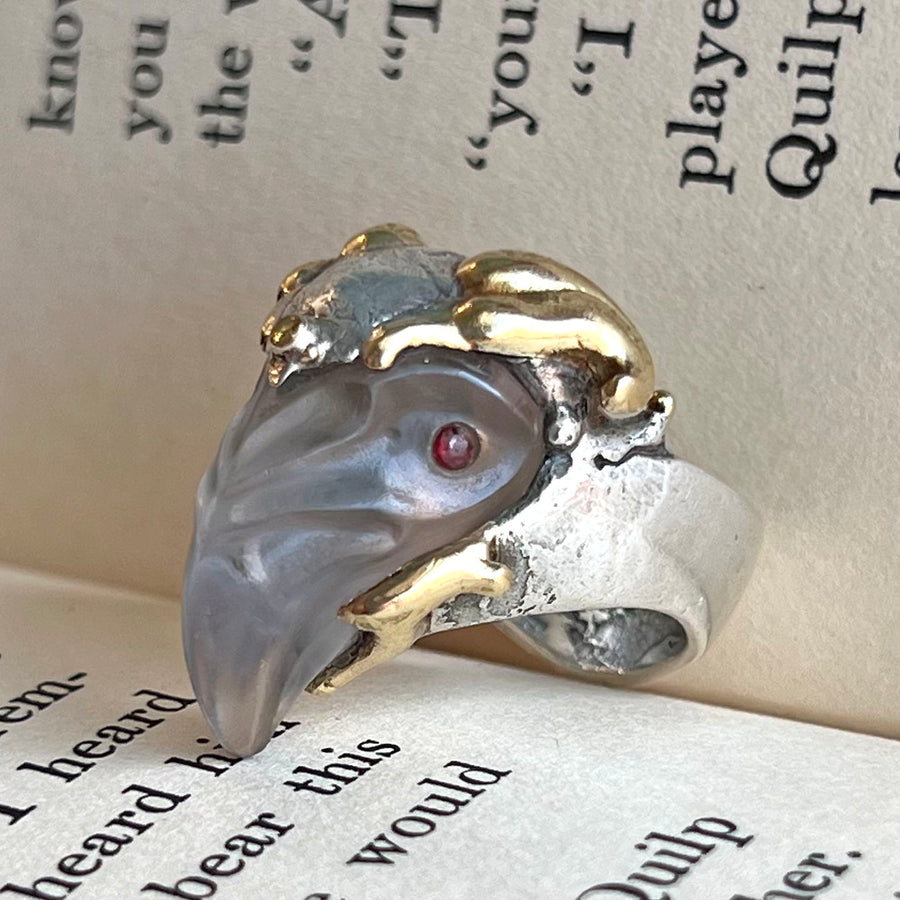 A vision born from myth and moonlight, this sculptural ring evokes the power of ancient creatures and the shadowy wisdom they carry. The bird’s head, carved in ghostly, translucent rock crystal, emerges like a vision from mist, its garnet-set eyes glowing with quiet intelligence. Swooping gold crown the head and clutch the jawline, wrapping protectively around a wide, textured silver band. It’s a ring for the dreamers who walk in both sunlight and storm, for those who understand the language of birds.