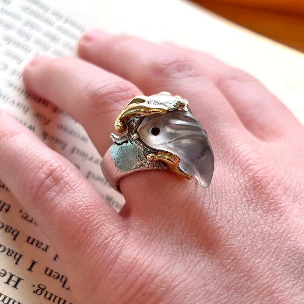 This remarkable ring is a handcrafted piece in silver, accented with gold detailing. The head is carved from natural rock crystal, and the eyes are two round-cut garnets measuring 2 mm each. The ring measures 26.5 mm from beak to back, 21.6 mm across the face, and 13.6 mm deep. The substantial silver band is 9.8 mm wide and has a handmade feel. It weighs 17.45 grams and is a size 6.5 US. There are no maker’s marks visible, but the craftsmanship speaks for itself.