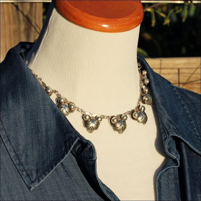 This Vintage silver collar was handcrafted in South Africa around 1960. Detailed leaves with silver bulbs decorate this unique chain link necklace. The hallmark for silver purity reads, ‘C.980’, for 98% silver (by contrast sterling silver is 92.5% silver). It weighs 62.7 grams and measures 16.5 inches in length.
