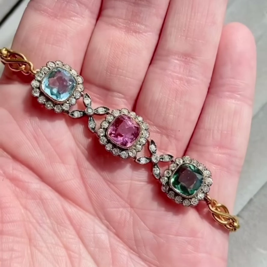Late Victorian Gemstone Diamond Bracelet 18k Gold Tourmaline Aquamarine