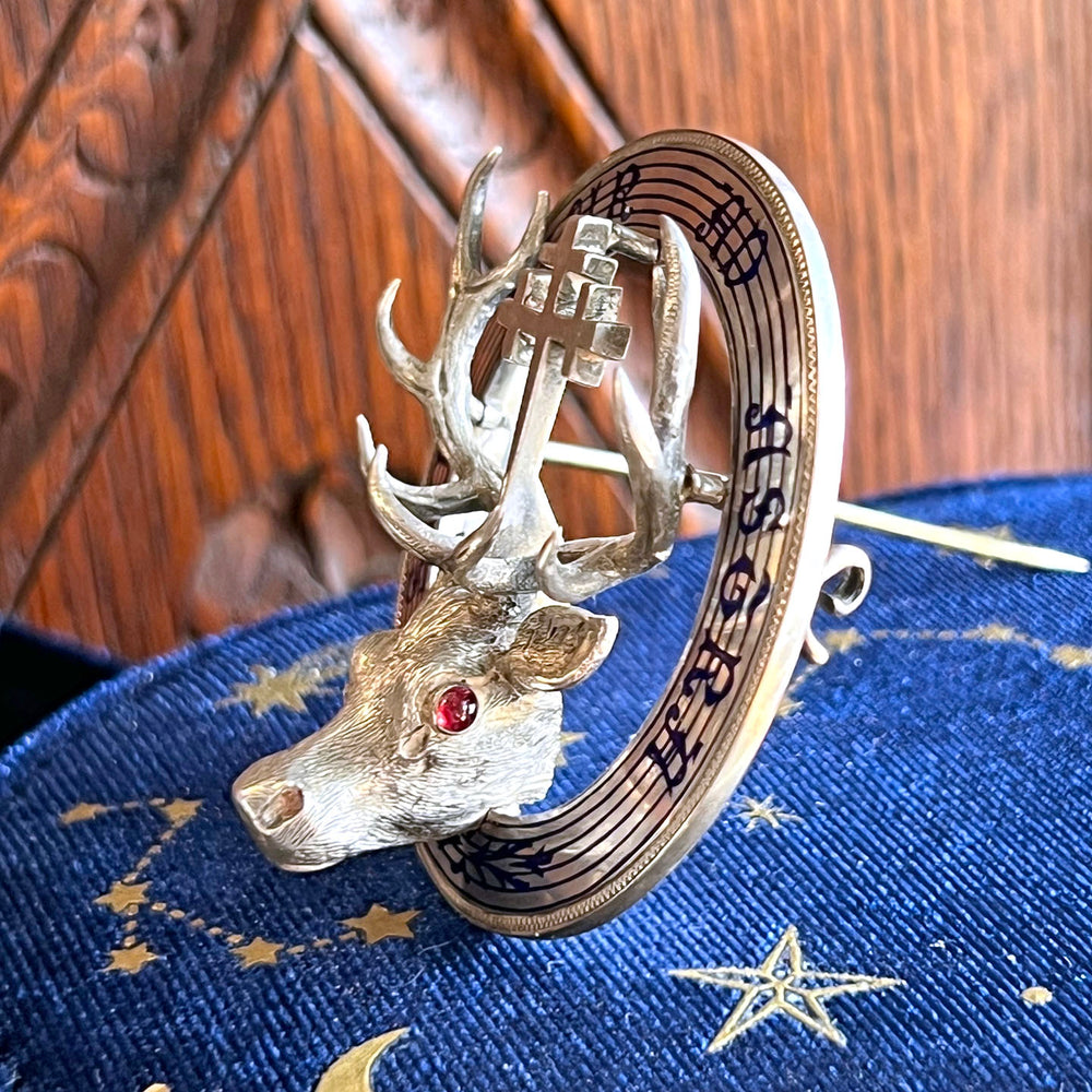A symbol of divine revelation and noble spirit, this extraordinary brooch pays homage to St. Hubert, the patron saint of hunters. A striking stag emerges in sculptural silver, its antlers framing the radiant cross, a vision said to have appeared to Hubert in the forest, forever changing the course of his life. Encircling the stag’s head is an enameled garter, inscribed with DIS ITUR AD ASTRA "Thus one goes to the stars", a celestial motto of ambition and destiny.