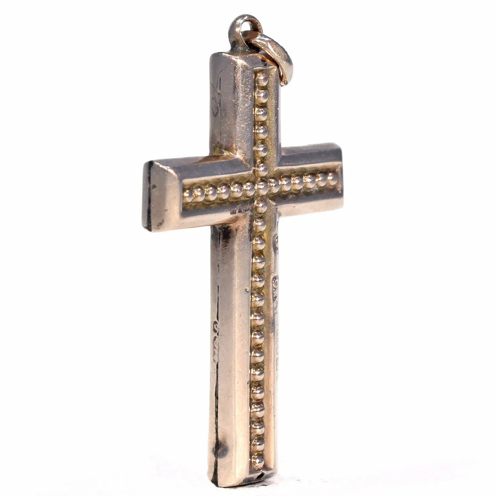 This cross measures 40 mm from top to bottom including the bale and 20.8 mm across at the widest point. The cross is hollow and it does have a bit of discoloration along the seam as well as a few dings, I kind of loved it anyway, in its simplicity and beauty. The price reflects the condition. This lovely old cross weighs 1.9 grams.