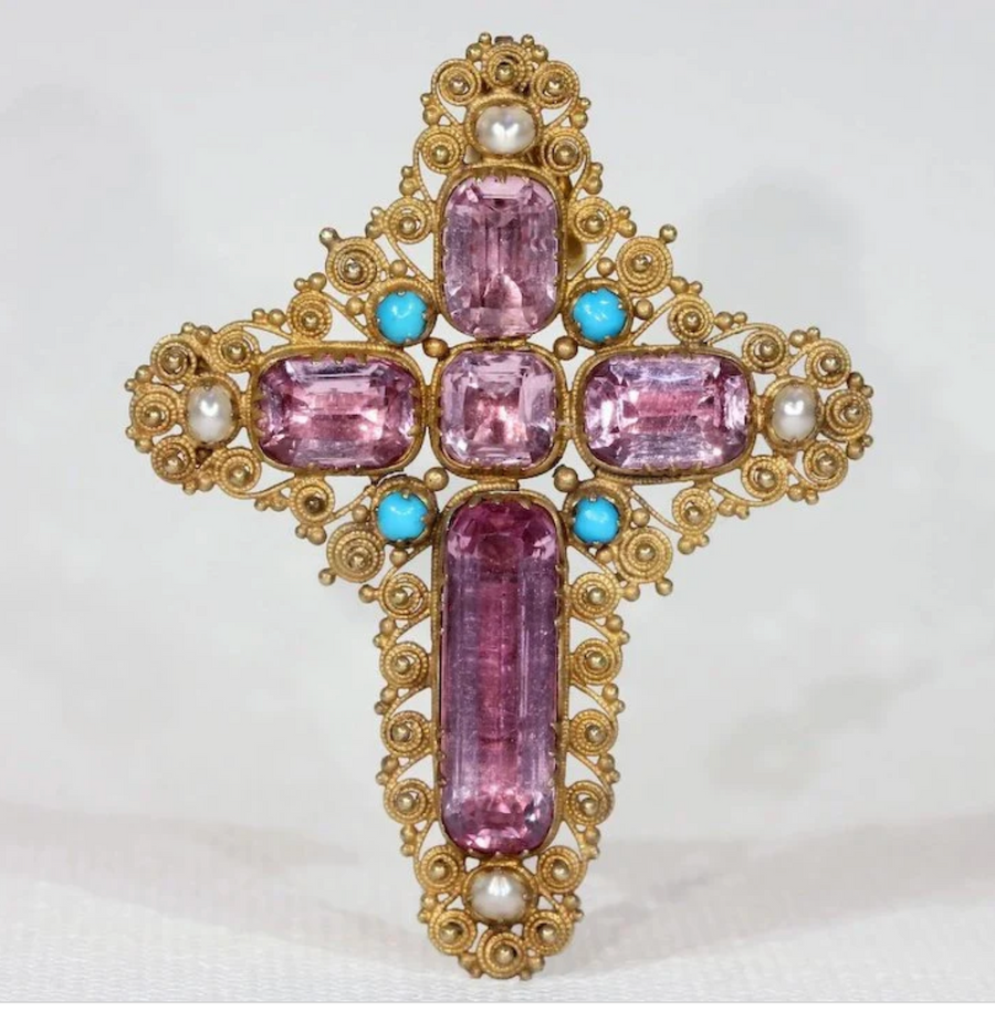 The Georgian Era saw quite a few upheavals in fashion and culture in its 100 + year history. Topaz was a popular gemstone throughout the era, along with garnets, emeralds, rubies, pearls, and turquoise. Crosses and crucifixes were also in favor. Many gemstones were still foil-backed while Old Mine cut diamonds were just beginning to be open-backed. The end of this era saw intricate designs with metal smiths using twisted gold wire in foliate designs called cannetille work, this was a style choice made to make the piece pop with just one glance. This beautiful cross is an excellent example of this craftsmanship. Gemstones were worn by the upper echelons of society, and primarily by royalty. Ladies of the time would wear a suite of matching jewelry. If a lady was to wear this cross as a pendant, she’d likely have matching earrings with dangling pink topaz and a bracelet as well.