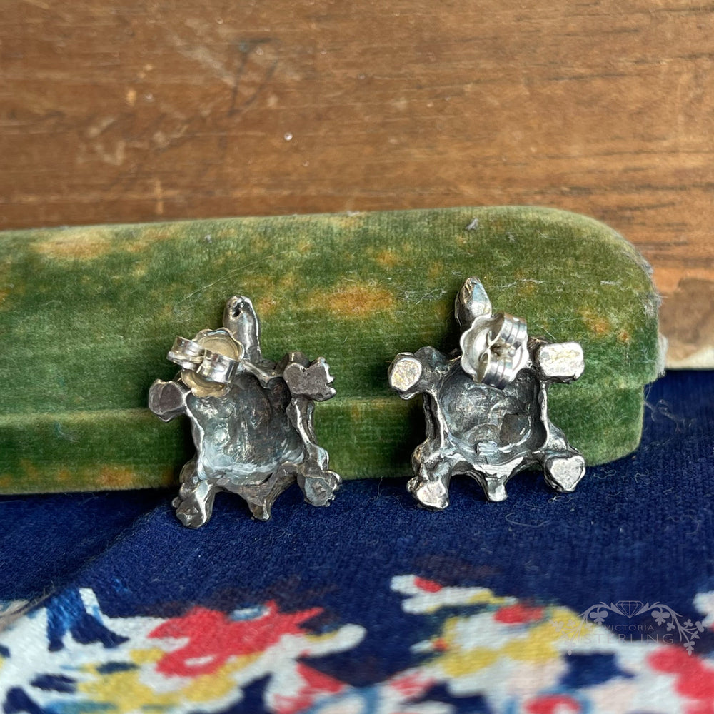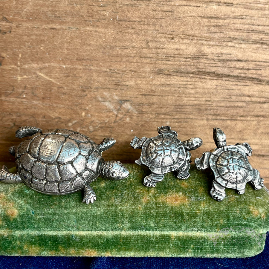 The turtles are marked ’925’ and the hollow brooch measures 24.7x41.1x13.4 mm and weighs 5.4 grams; the earrings are 22.2 mm tip to tail and 19 mm across, and they weigh 6.9 grams together. Vintage, maybe 1960s? (Box not included).