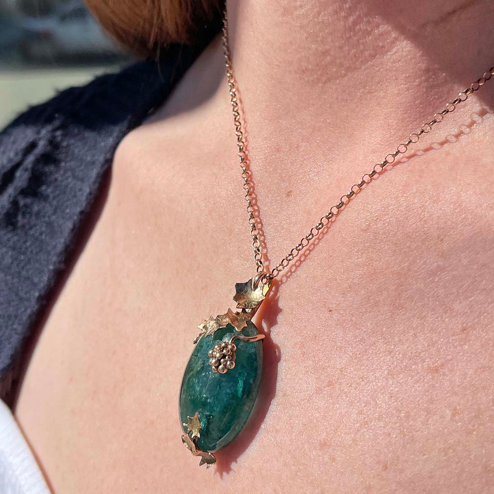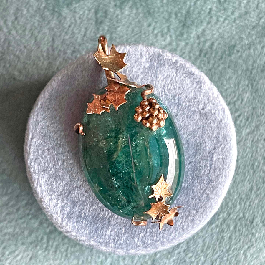 This meticulously handcrafted pendant of 9 karat gold is shaped in the form of luscious grapes and delicate grape leaves. At the heart of the pendant lies a spectacular tourmaline, polished to perfection and radiating with a mesmerizing blend of lush green hues. The stone measures an impressive 33x24x9.9mm and weighs approximately 66.5 carats. Overall, this pendant measures 47.2 mm north to south including the bale, and 24 mm across at its widest point and its depth of 13.5 mm added a touch of dimensionality, as if the grapes and leaves were plucked straight from the vine. It is marked ‘9ct’ for the 9 karat gold content and ‘RF’ for the unknown maker, and weighs 14.6 grams.