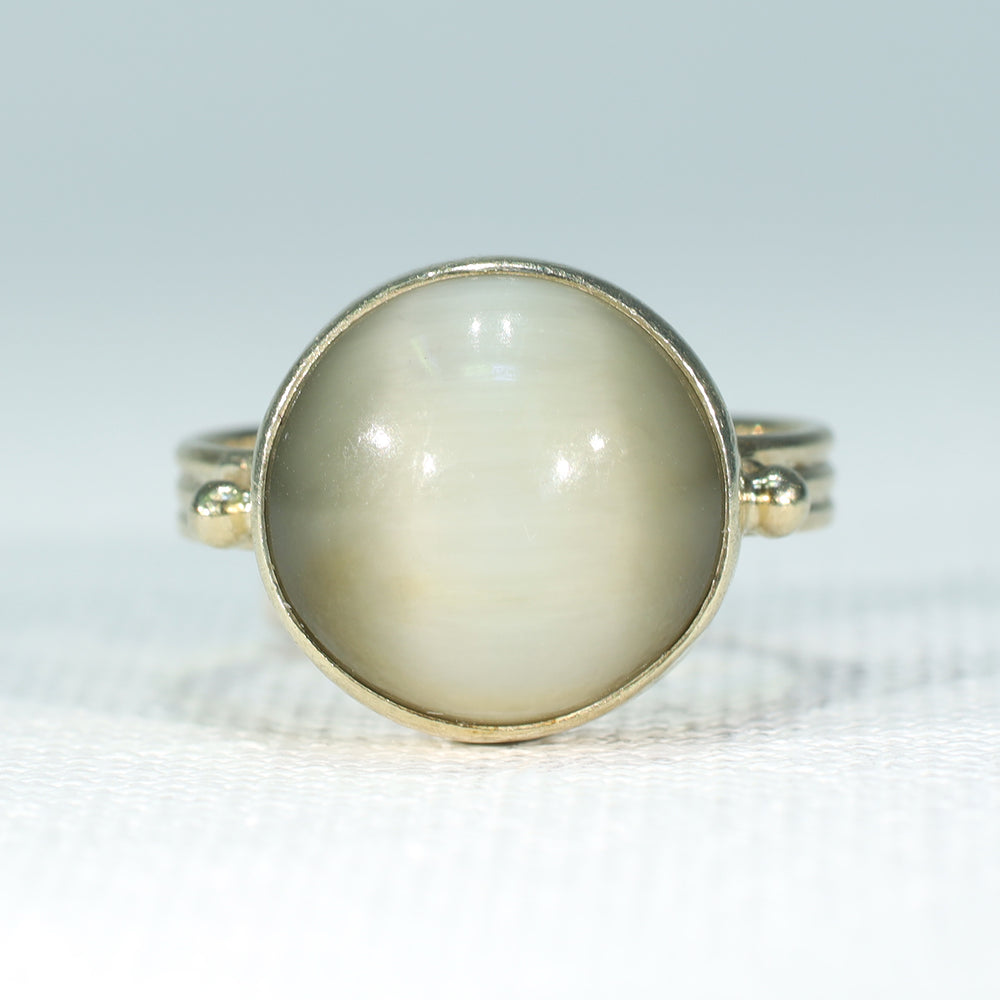 This elegant ring is a size 6 and weighs 3.5 grams. The gleaming cat’s eye quartz cabochon is 12 mm round, quite eye-catching (pun intended,and true.) A clever design features two small spheres of gold next to the round stone where it meets the band; such a wonderful artistic touch which repeats the organic round shape, providing satisfying symmetry.