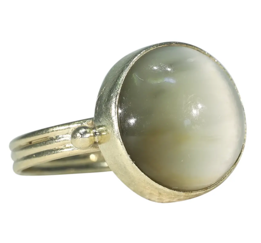 Chatoyancy. Isn’t that a great word? It comes from the French “oeil de chat,” or “eye of the cat," and it refers to the luminous band of concentrated light across the width of a precious stone. Indeed, the “eye” of this gorgeous 14k Cat’s Eye Quartz Ring beams with ethereal brightness, and captures the spotlight with its sultry beauty and grounded confidence. It’s a stunner.