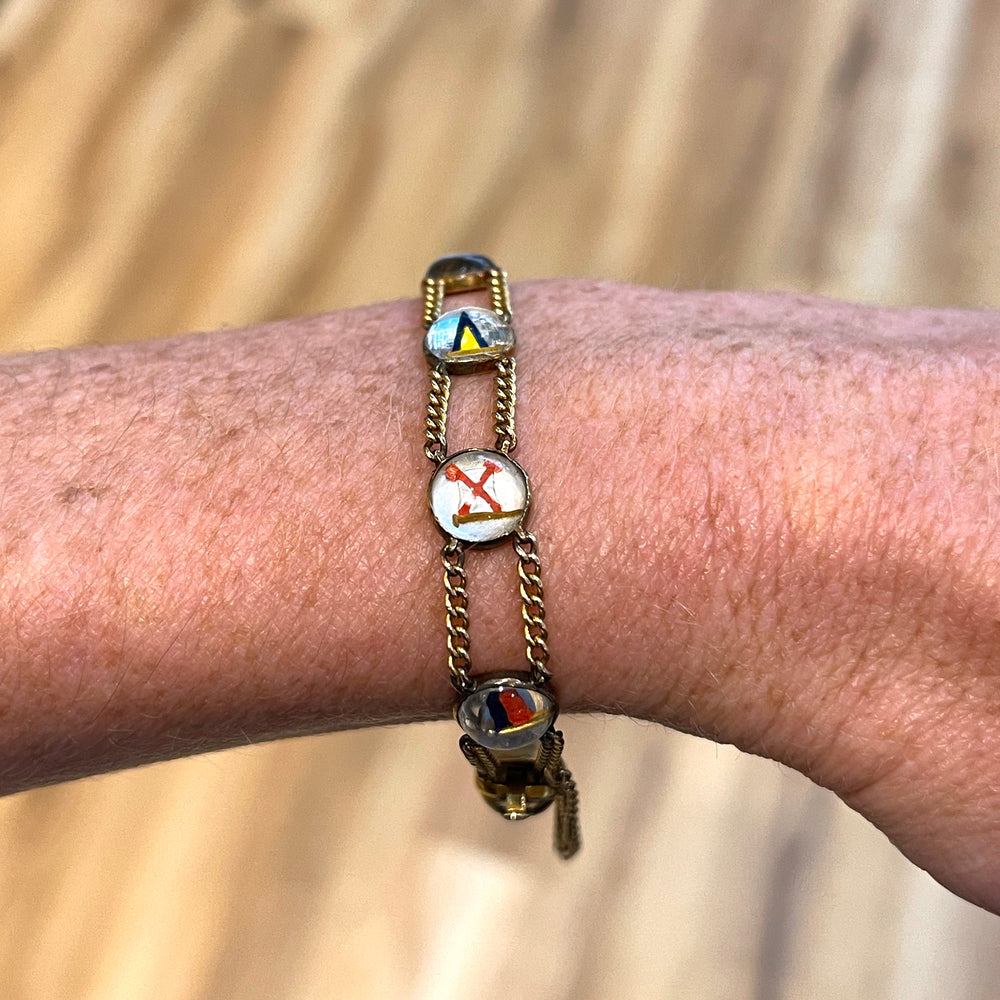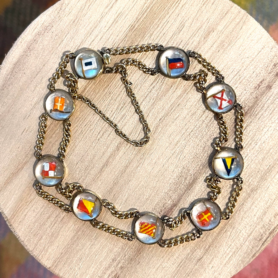 This wonderful bracelet uses the art of the Essex crystal, a cabochon of rock crystal is carved from the back and then reverse painted to give it a very three dimensional look. Each crystal on this station necklace is a boat flag letter which as a whole spells out ‘Ever Yours’. This Art Deco bracelet dates to the 1920s and is marked with ‘15k’ for 15 karat gold. The bracelet measures 7 inches long and the set crystals are 8.7 mm in diameter and 4.3 mm high. Made in England.