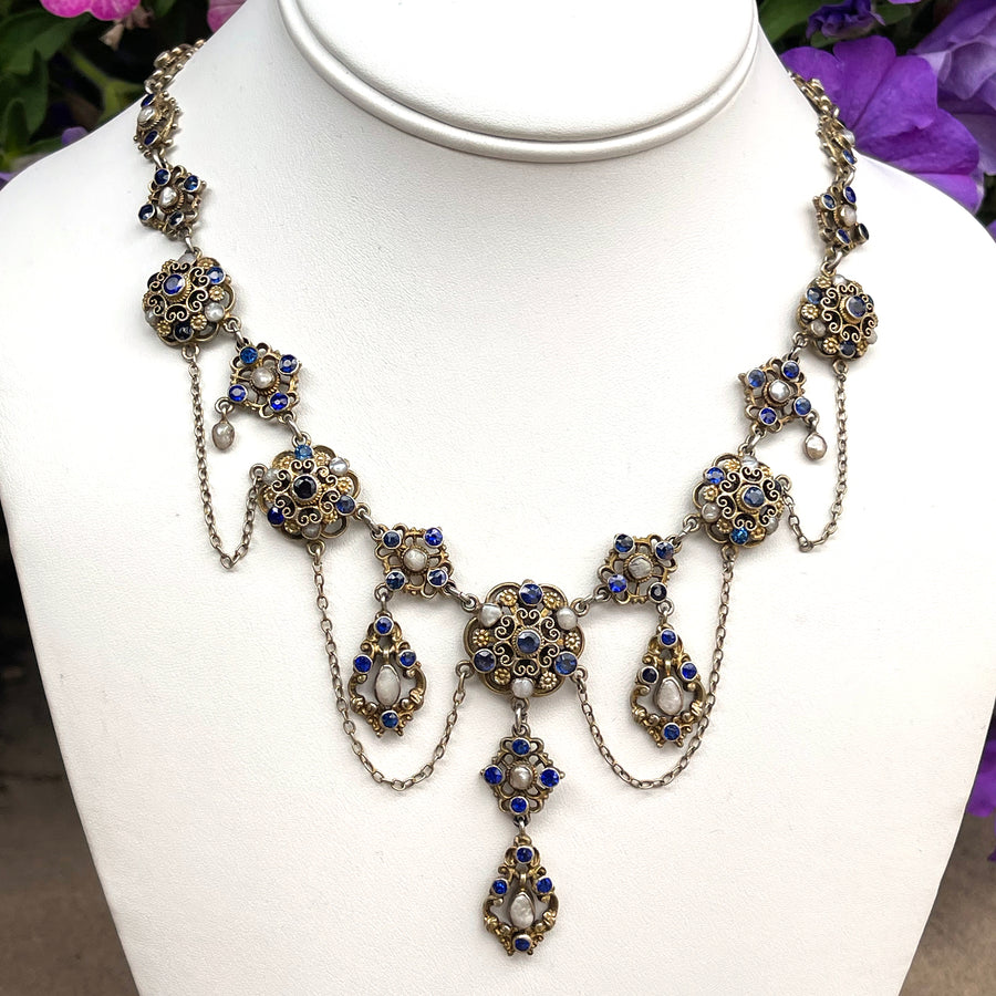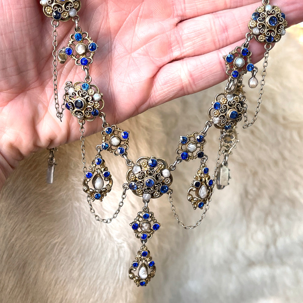 Antique Austro-Hungarian Necklace Blue Paste and Pearl Silver Gilt