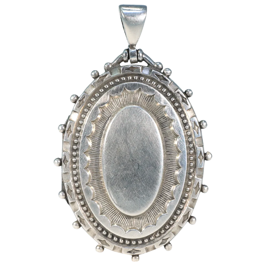 This wonderful locket was hand crafted in about 1880, it has panache, style that is. It was most likely made in the English jewelry center of Birmingham, but it has no marks, we’ve carefully tested it to verify that it is, indeed, sterling silver. The locket has a wonderful sunburst with geometric details repoussed in the front and a soft and smooth rounded oval back. This locket opens to reveal two frames ready to hold your personal photos. The locket measures 55 mm north to south including the bale and 33.8 mm across, it’s 11.1 mm thick and weighs 15.8 grams.