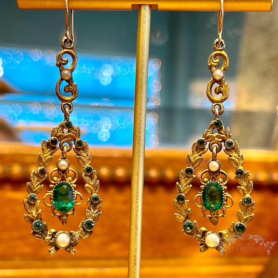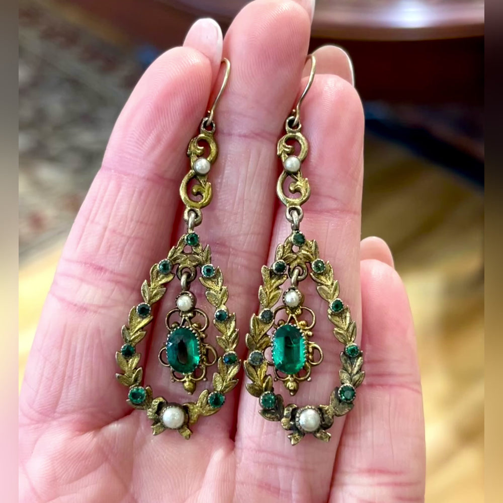 These super stylish beauties were hand crafted in the Austro-Hungarian style in about 1880. They are set with rich green paste gems and faux pearls, very typical of Austro jewelry of the period. They are wonderfully hand crafted so don’t be surprised when everyone mistakes them for the emeralds and gold.