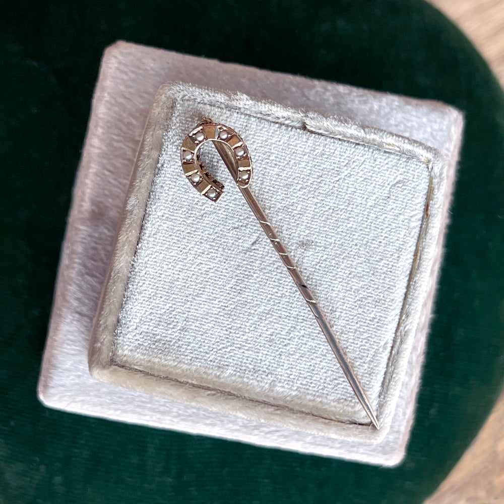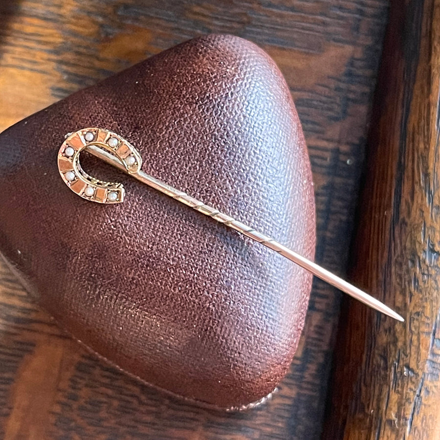 Behold a dashing Victorian stickpin, exuding timeless charm in its horseshoe shape. Crafted in 9 karat English gold, this stickpin exemplifies the refinement of the era. Adorning the horseshoe, luminous pearls shimmer with elegance, their iridescent beauty capturing the light with each movement.